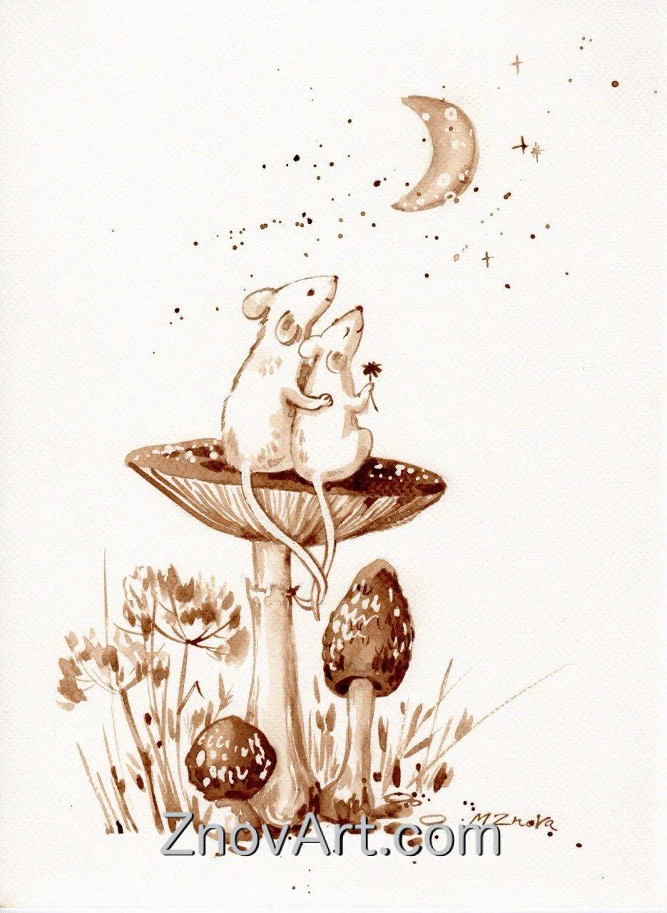 A romantic moment of two mice sitting on a mushroom and looking at the moon, which looks so much like a piece of cheese. “I’ll give you all this cheese,” says young Romeo.