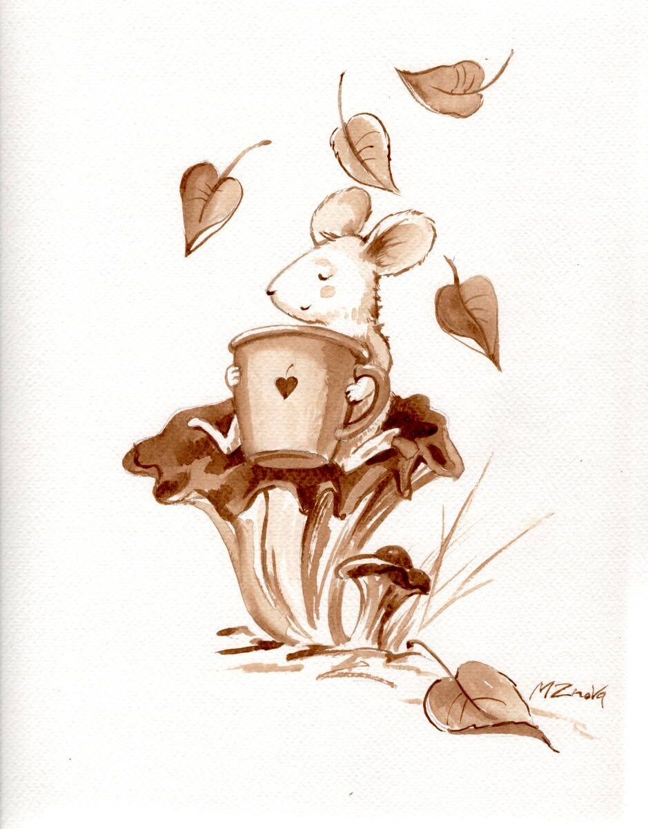 The leaves fall quietly, and the happy mouse enjoys his morning coffee in peace.