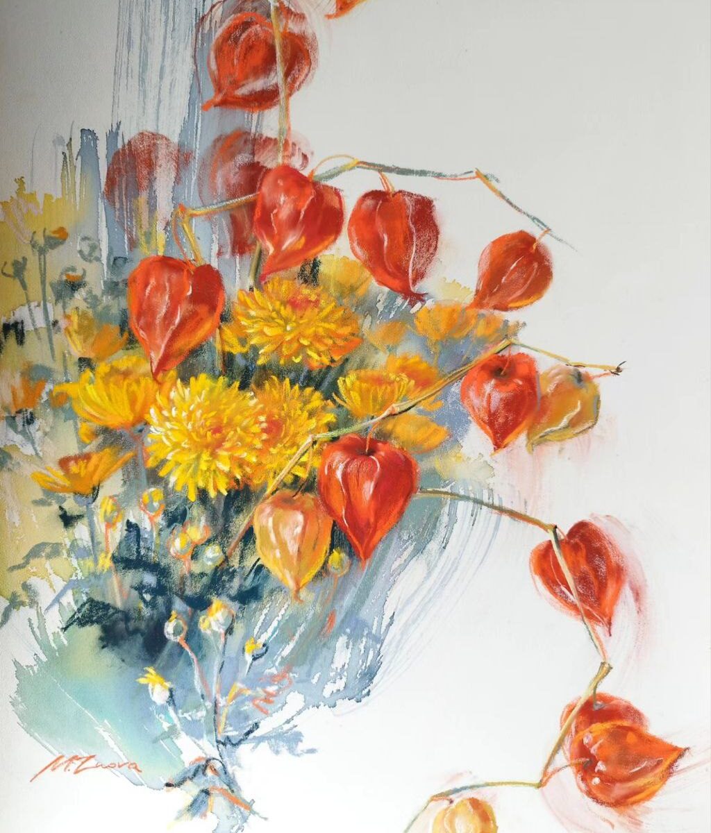#Flowers #Pastel #Watercolor #Physalis #Chrysanthemums #AutumnCanvas #FallFlorals #ArtisticExpression #WarmHues