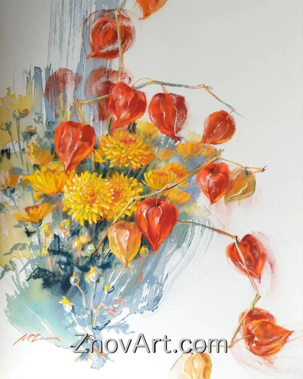 #Flowers #Pastel #Watercolor #Physalis #Chrysanthemums #AutumnCanvas #FallFlorals #ArtisticExpression #WarmHues