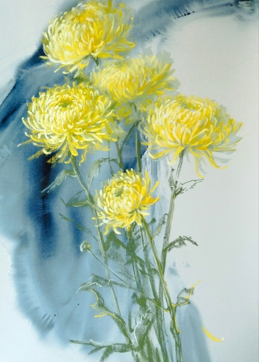 #Flowers #Pastel #Watercolor #Chrysanthemums #YellowBlooms #BlueBackground #FloralPainting #NatureArt #ZnovArt